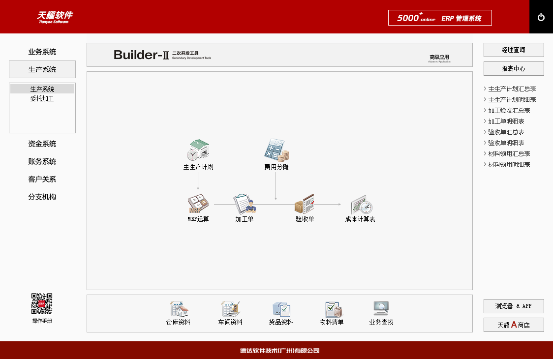 《天耀5000+.online PRO》作為ERP管理軟件,特別適合中型企業(yè)使用。軟件支持云部署和桌面服務(wù)器部署及APP部署,并科學(xué)地融入Builder-II二次研發(fā)工具,滿足企業(yè)管理的個(gè)性化需求,大大提升了應(yīng)用效率和安全性。軟件全面實(shí)現(xiàn)供應(yīng)鏈業(yè)務(wù)管理、生產(chǎn)管理、資金管理、財(cái)務(wù) 管理、客戶關(guān)系管理、異地分銷、遠(yuǎn)程配送、多機(jī)構(gòu)集團(tuán)化管理。支持局域網(wǎng)/互聯(lián)網(wǎng)多用戶應(yīng)用,實(shí)現(xiàn)異地多機(jī)構(gòu)、 多店面、多倉(cāng)庫(kù)等遠(yuǎn)程應(yīng)用,同時(shí)支持APP移動(dòng)終端應(yīng)用,數(shù)據(jù)實(shí)時(shí)同步,安全、穩(wěn)定、高效。
